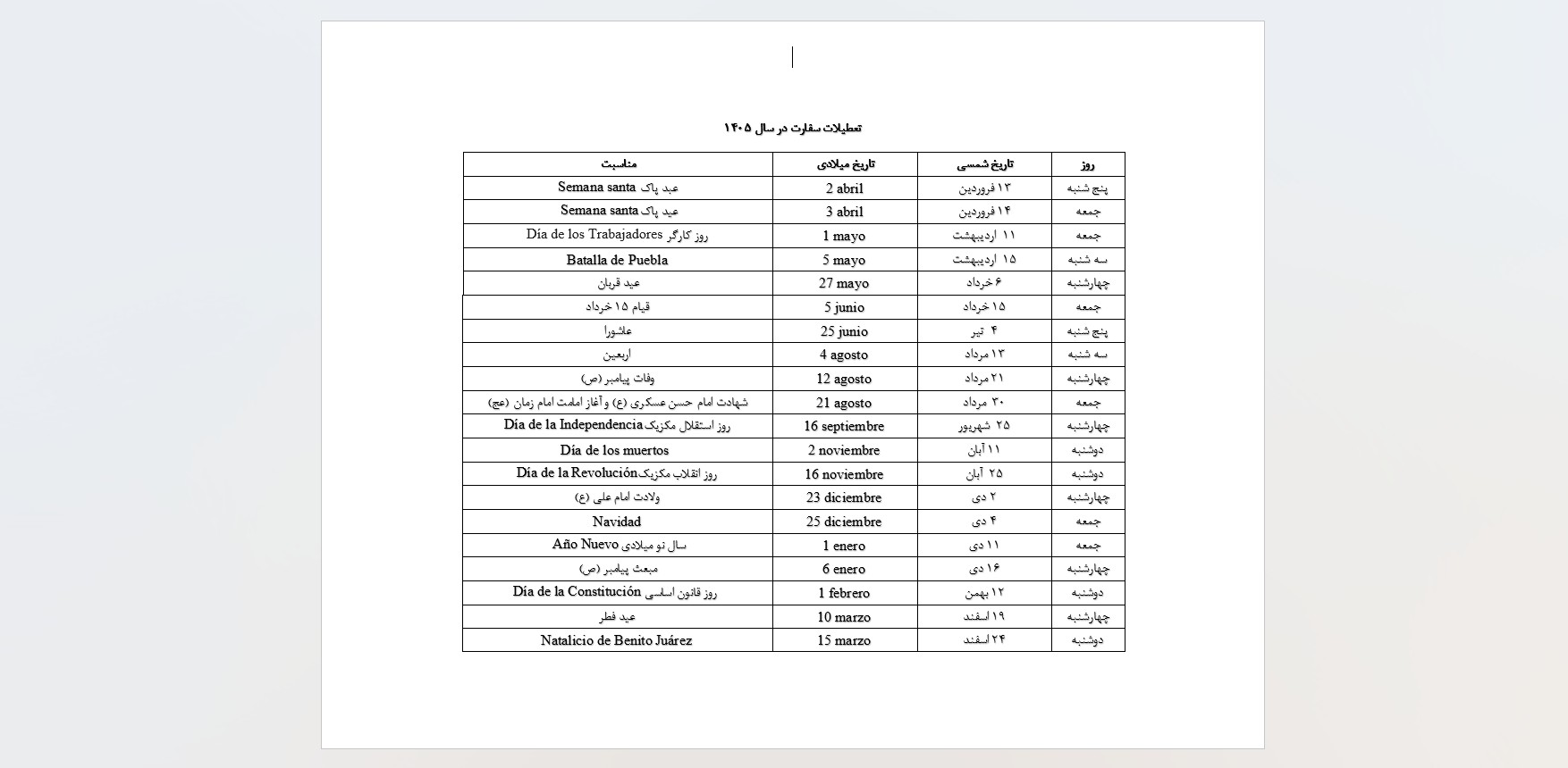 لیست تعطیلات سفارت در سال 1405