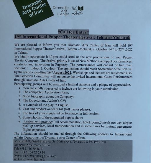 El Centro de Artes Dramáticas de la República Islámica de Irán llevará a cabo el 19º Festival Internacional de Teatro de Marionetas, Teherán-Mobarak, del 14 al 22 de octubre de 2022 en Teherán.