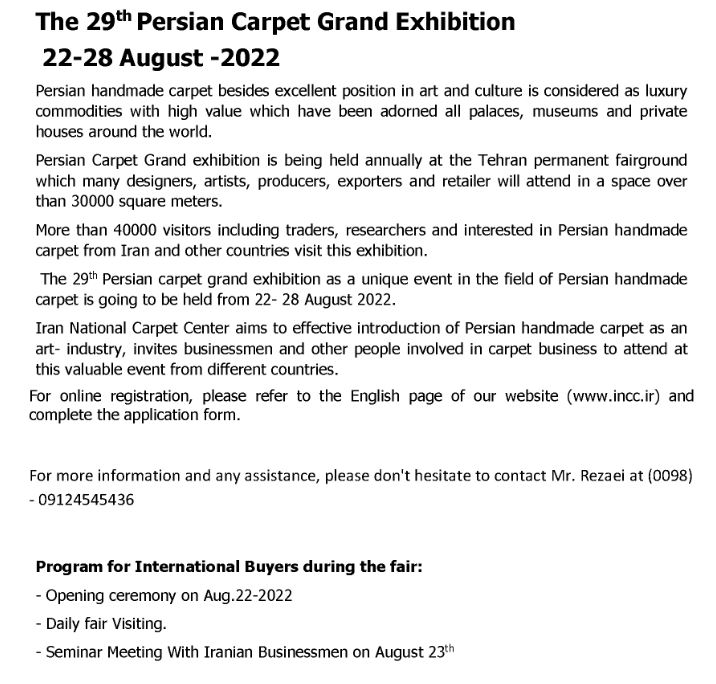 Se celebrará la Vigésima Novena Gran Exposición de Alfombras Persas, entre el 22 a 28 de Agosto del 2022 en Teherán.