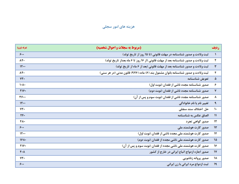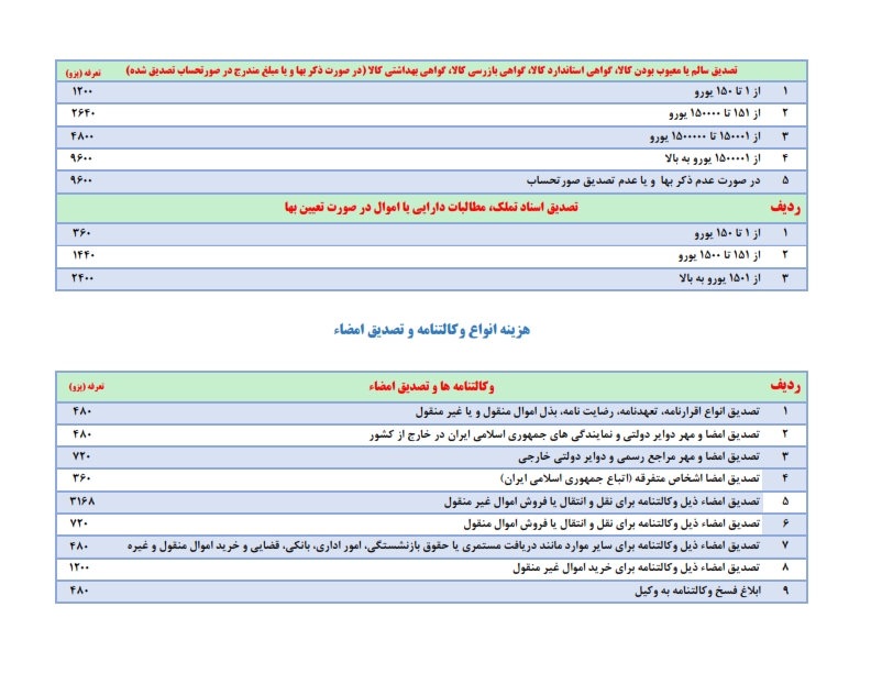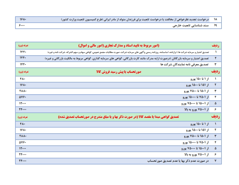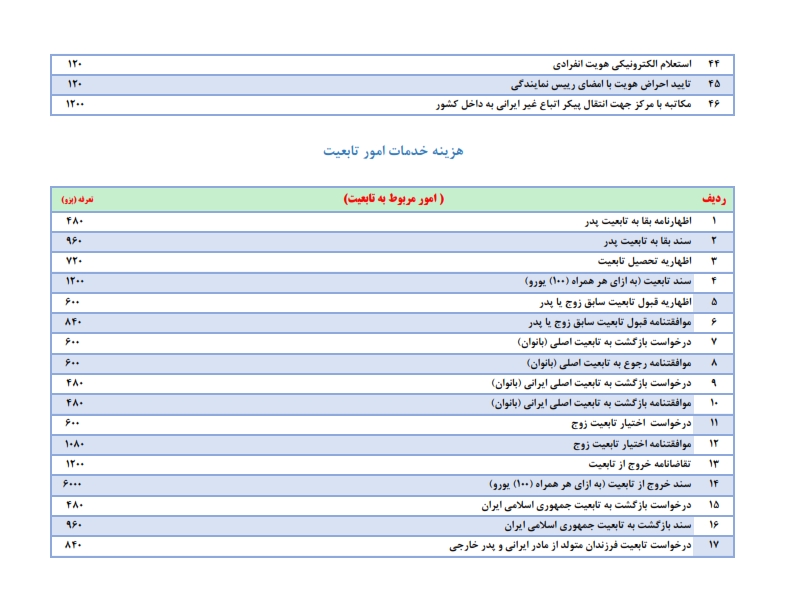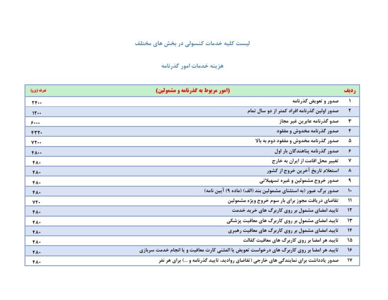 هزینه های بخش های مختلف خدمات کنسولی طبق جدول زیر می باشد.